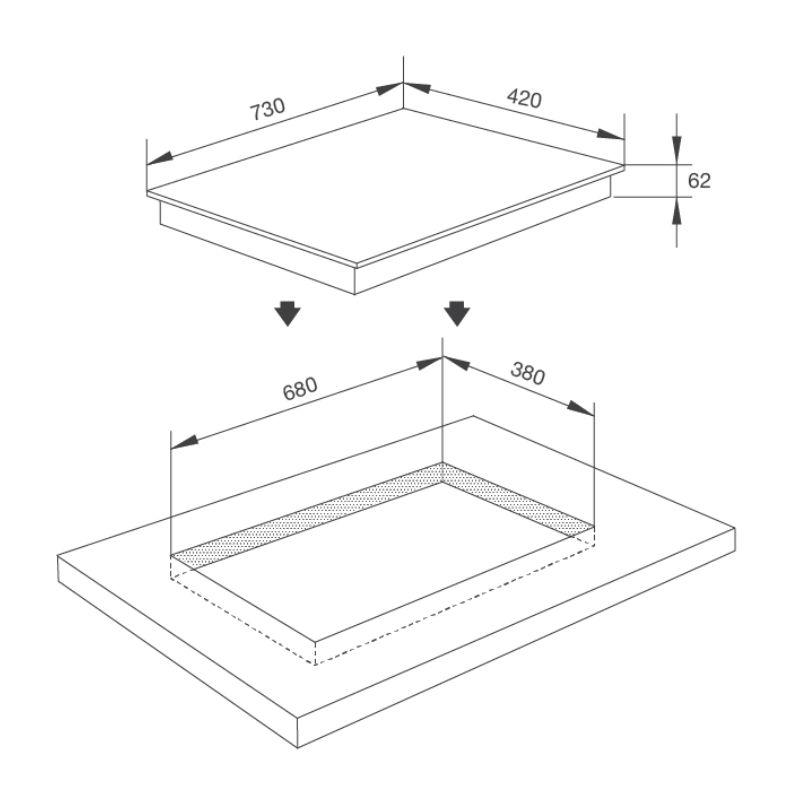 - Kích thước bếp (DxRxC): 730 x 420 x 62 mm