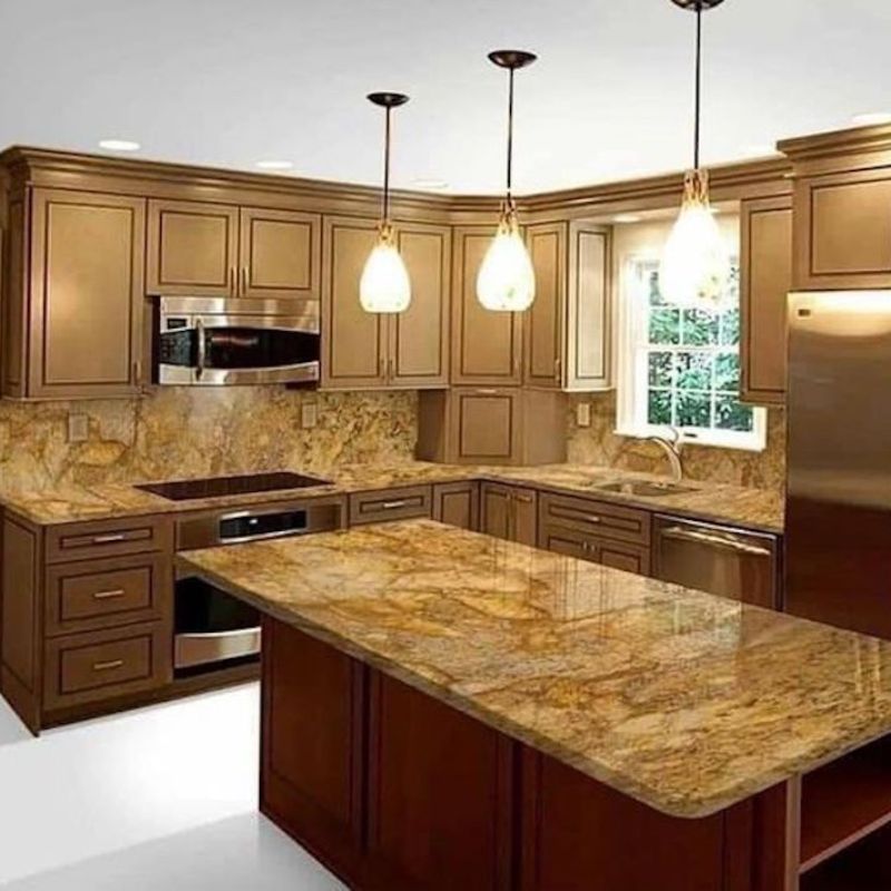 - Màu sắc: Màu vàng đặc trưng của đá Solarium mang đến cảm giác ấm áp, sang trọng và tạo điểm nhấn cho không gian bếp.
