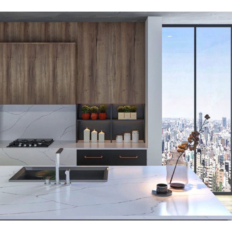 - Chứa khoảng 90% cốt liệu là thạch anh tự nhiên – khoáng vật có độ cứng cao nhất chỉ sau kim cương, có khả năng chống thấm, chống xước, chịu được các tác nhân ăn mòn hóa học – Vượt trội so với đá Granite và đá Marble.