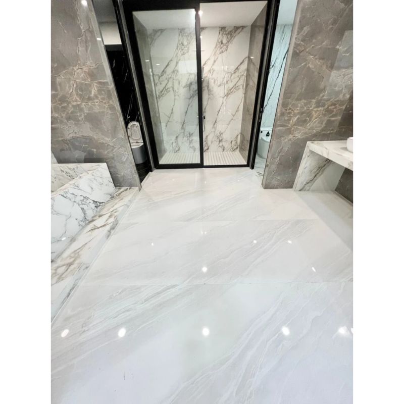 - Chống thấm nước tuyệt đối: Nhờ công nghệ nung kết hiện đại, đá nung kết có khả năng chống thấm nước hoàn hảo. Đây là đặc tính vô cùng quan trọng đối với một vật liệu ốp lát trong môi trường ẩm ướt như nhà vệ sinh.