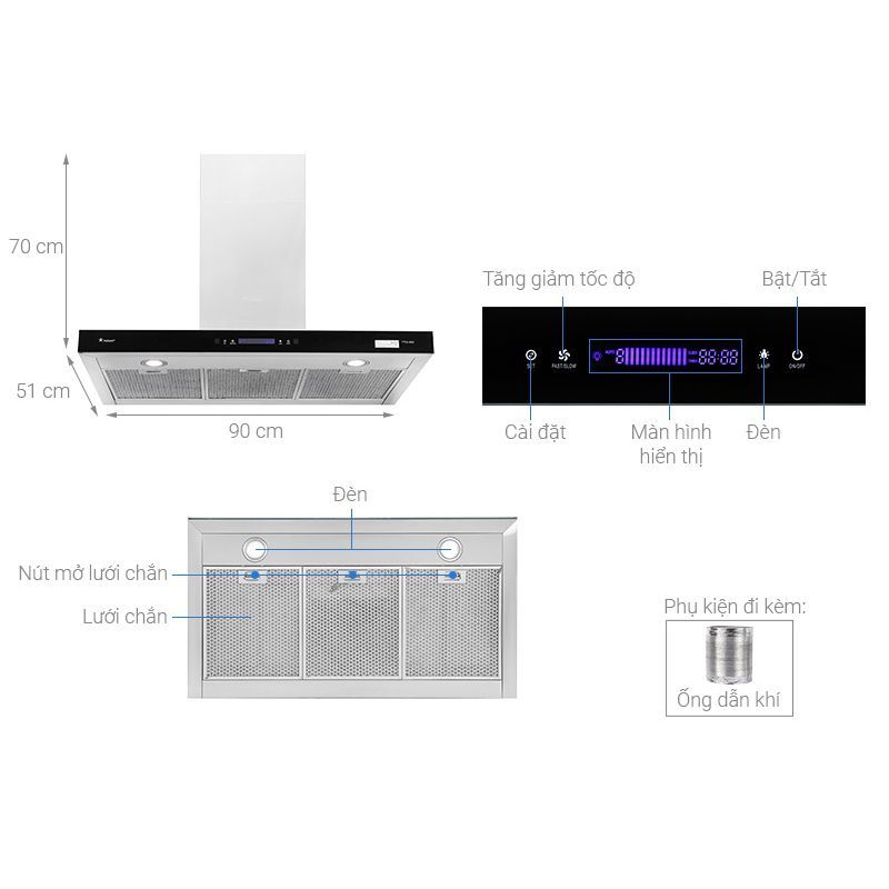 - Điều khiển cảm ứng nhạy bén, có màn hình hiển thị, 3 tốc độ quạt hút tùy chọn.